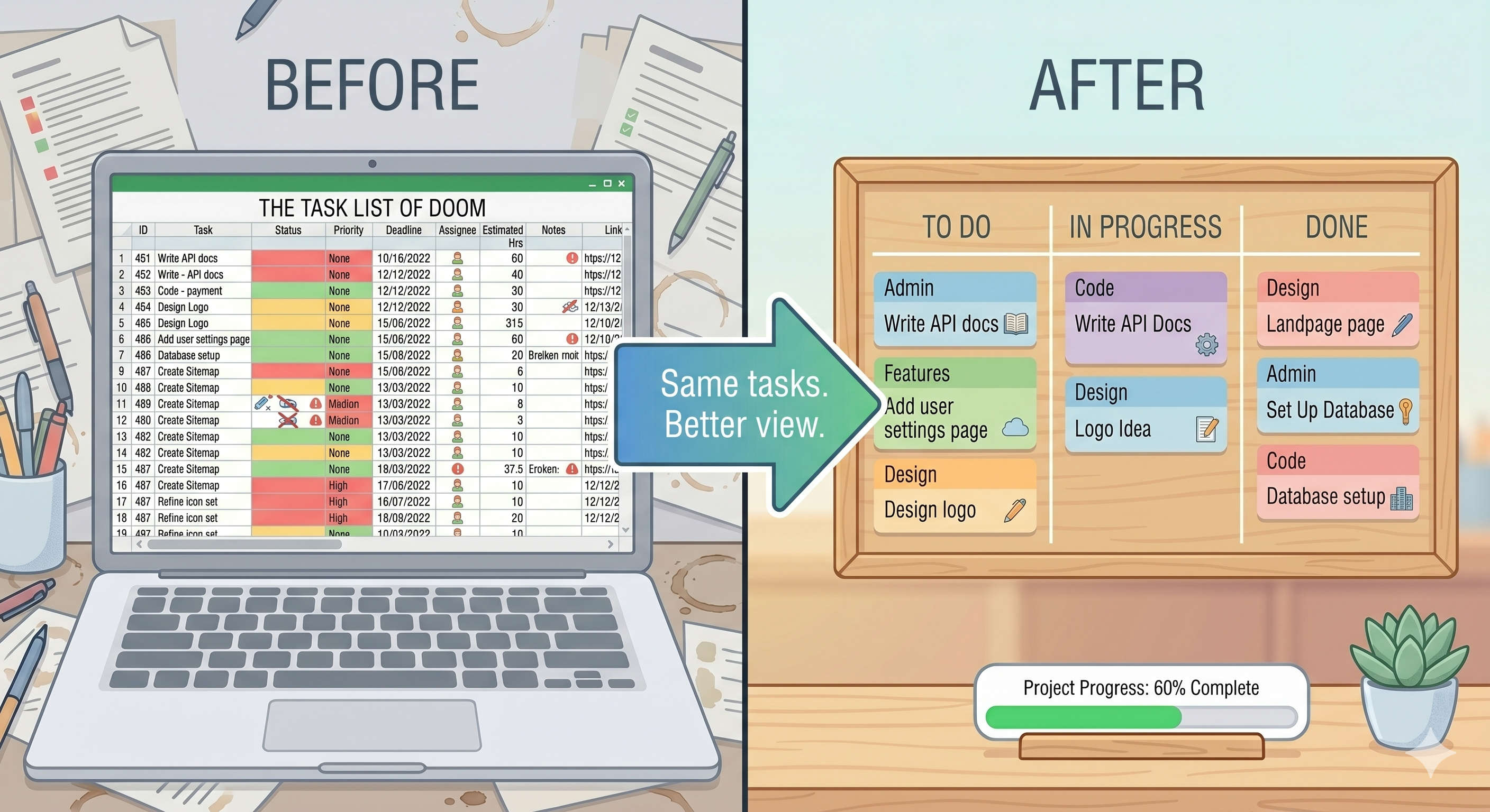 With a spreadsheet, your tasks are data. With a Kanban board, your tasks are things that move. You can see them flowing from start to finish. You can spot what's stuck. You can feel the progress.